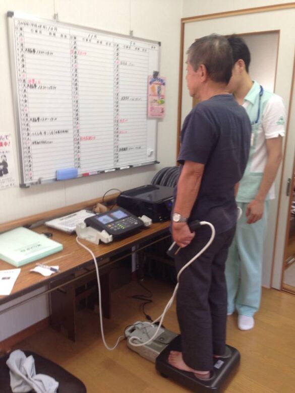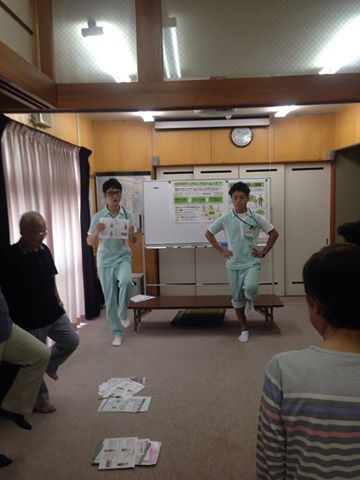 みどり苑の増田作業療法士、角井理学療法士がロコモティブシンドロームの説明、予防体操、体組成計を使って計測を行いました。