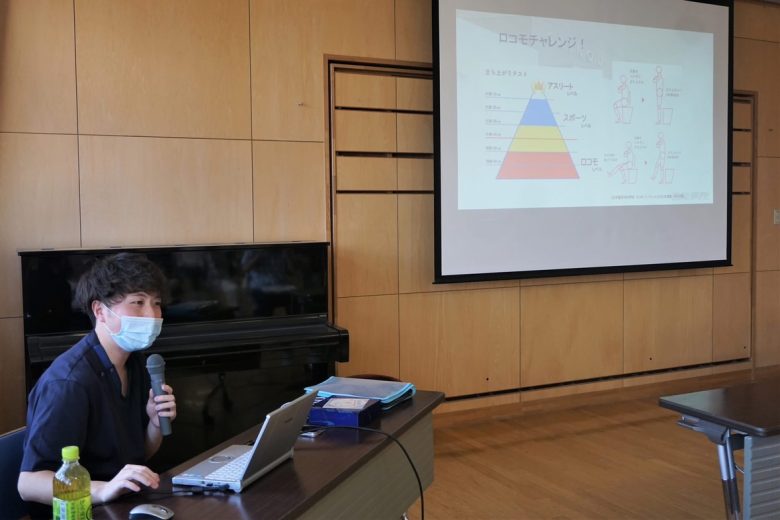 参加者の皆さんと五省会オリジナルロコモ体操で体を動かし、自宅でもできるロコモ予防トレーニングをご紹介。