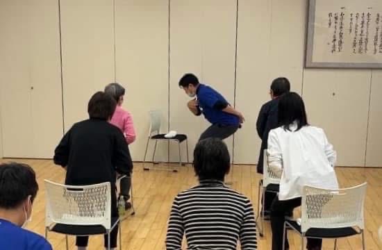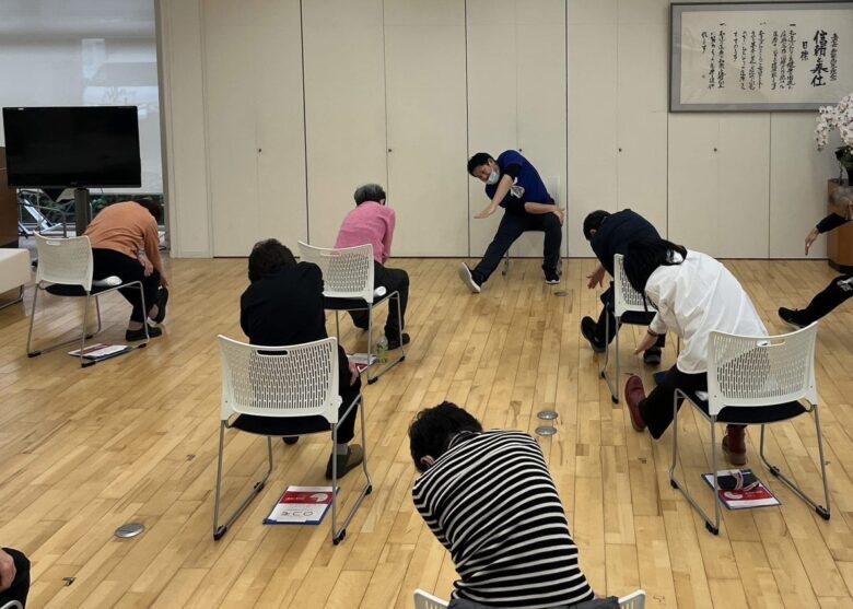 イベントでは、石田 高義理学療法士が“腸腰筋”を鍛えるロコモーショントレーニングをポイントごとに参加者と実践。使うものはバスタオルと椅子だけ!