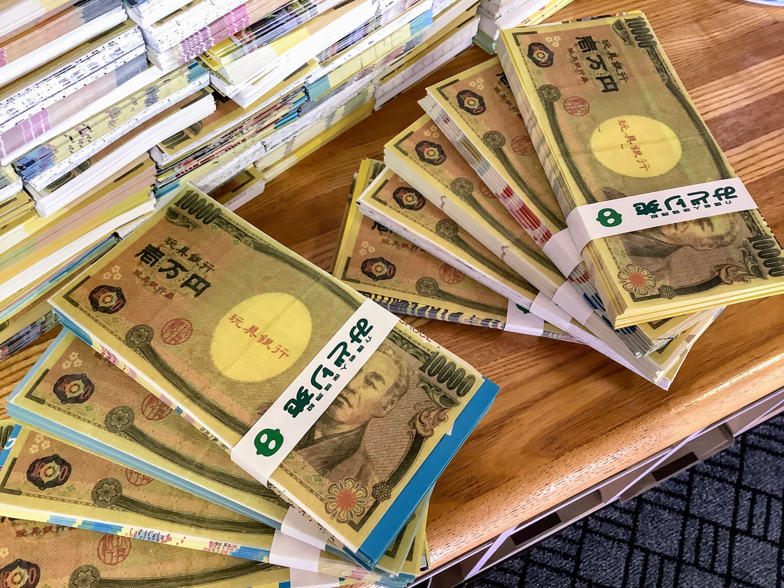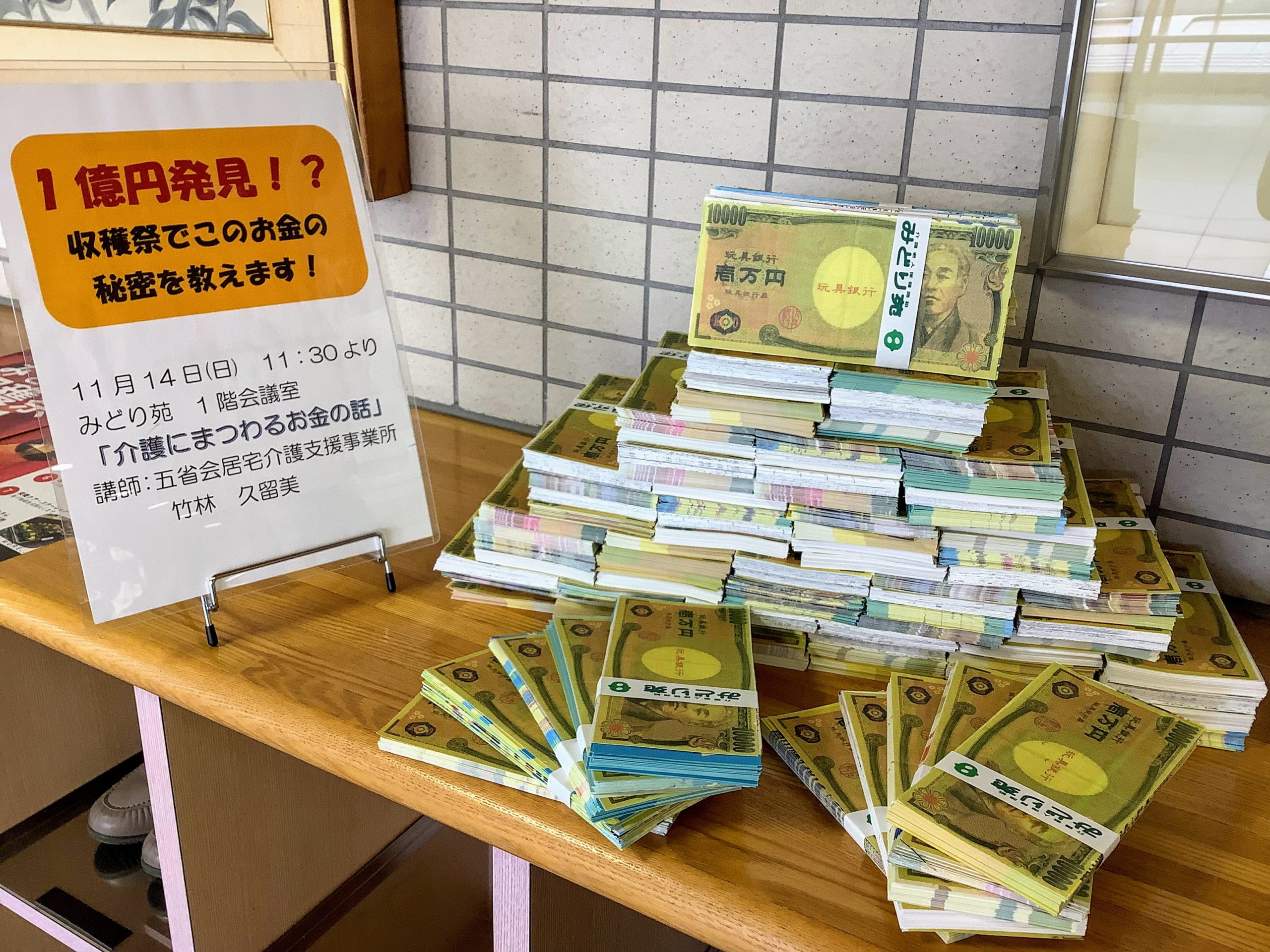 現在、みどり苑のエントランスに1億円(と同じくらい)の札束があります。