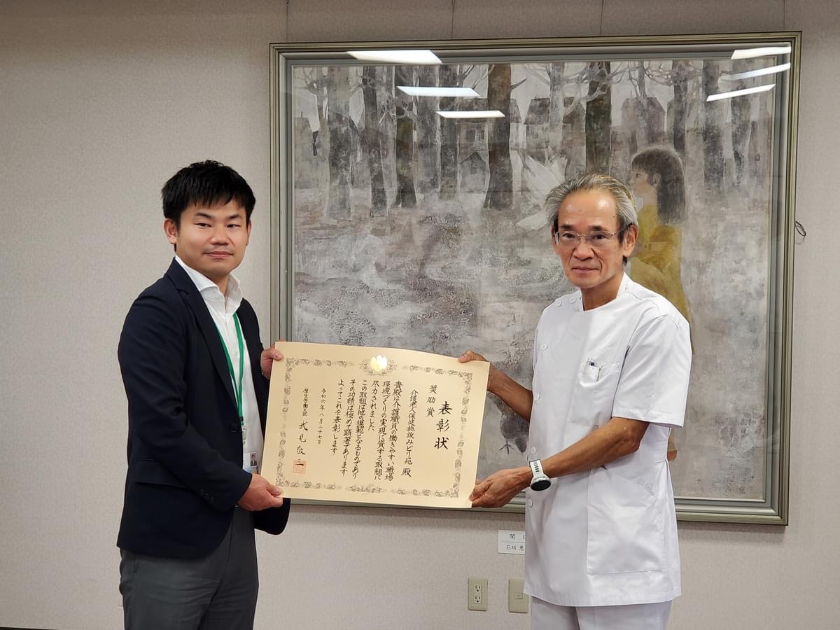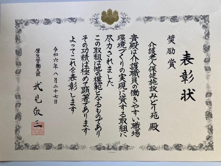 厚生労働省「令和6年度介護職員の働きやすい環境づくり 内閣総理大臣及び厚生労働大臣表彰」厚生労働大臣表彰 奨励賞を受賞しました。